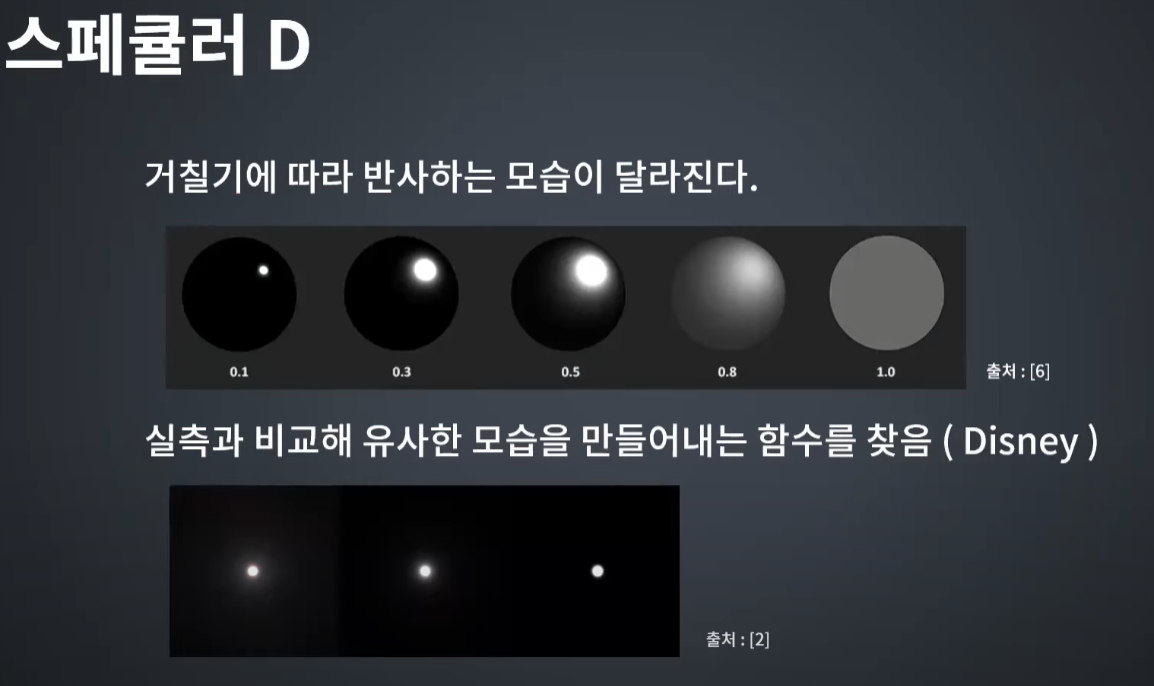 diffuss의 대부분은 표면의 거칠기 때문에 발생하는 것이 아님 diffuse reflection은 재질의 구성에 따라서 반사되었을 때 자신의 빛의 파장을 유지하지 못함 일반적인 경우에 표면 아래에서의 산란을 계산하기에는 너무 복잡하고 계산비용이 비싸서 albedo(반사율)라는 개념을 사용 specular는 산란이 없는데도 왜 albedo의 영향을 받는가? 평평한 면이라고 하더라도 diffuse는 막을 수 없다. 이상적으로 매끈한 평면은 존재안함