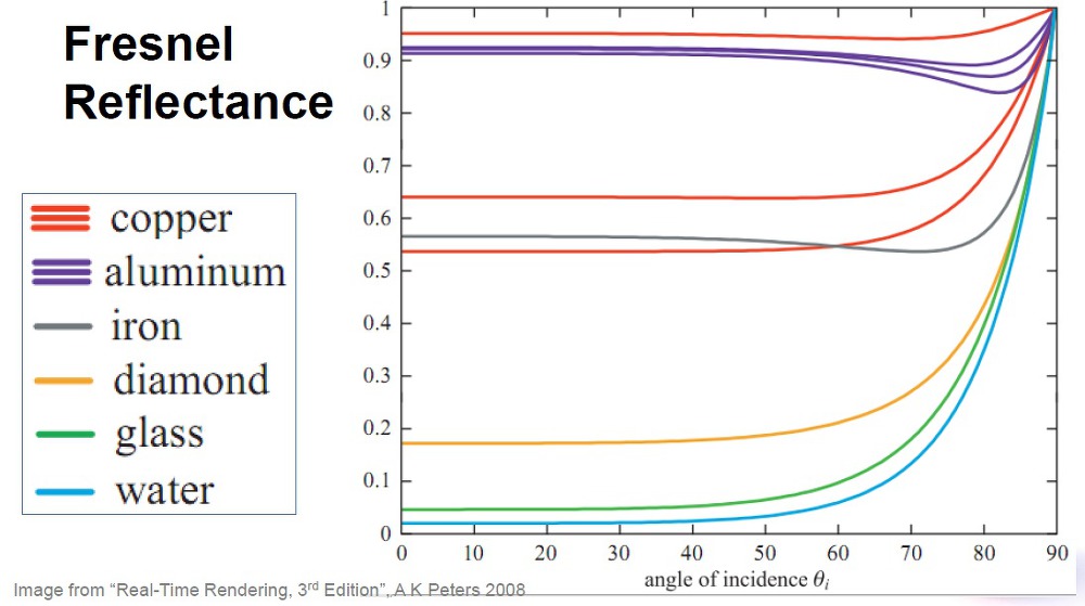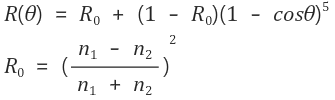 모든 각도에서의 IOR( Index of refraction - 굴절율)을 알 수는 없다 그래서 근사하는 식을 사용(슐릭스식) R_{0}은 0도에서으 반사율 값 대부분의 엔진이나 문서에서는 F0 (Fresnel at Degree 0)라고 표현