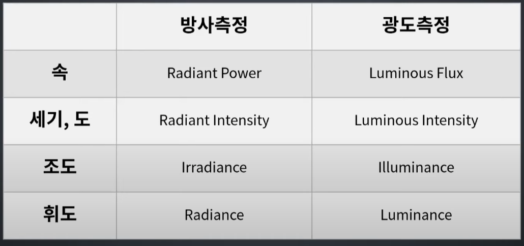 빛의 분석 : 학문적인 영역 : 방사측정(Radiometry) / 사용자 영역 : 광도측정(Photometry) << 실제 사용