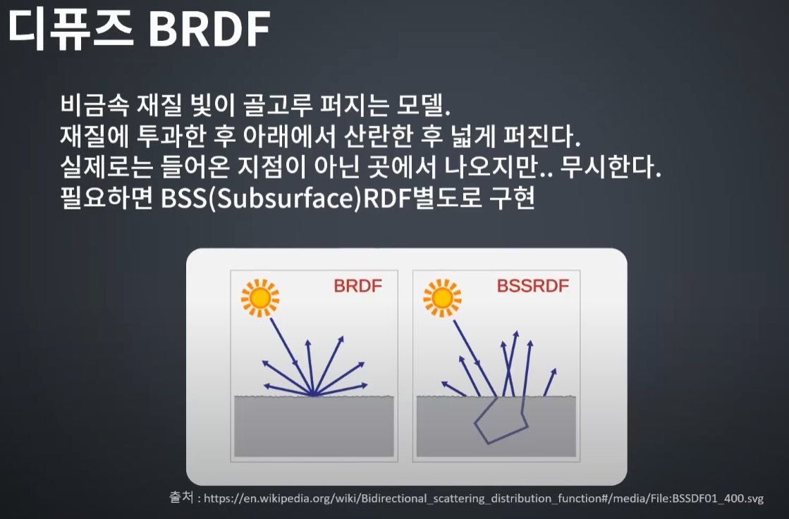 실제로는 비금속 재질에 빛이 오면 밑에서 산란 후 방출하지만 계산 편의성을 위해 한 곳에서 반사시킨다. 만약 따로 이 효과가 필요하다면(들어온 지점이 아닌 곳에서 빛이 방출) subsurface scarttering 처럼 별도로 구현한다.