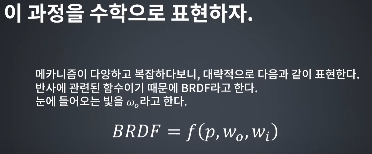 BSDF : bidirectional scattering distribution function 양방향 산란 분포 함수