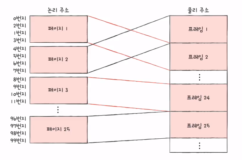 - 페이지 테이블의 페이지를 통해 프레임 번호를 찾고 변위를 더함으로서 물리 주소 얻기