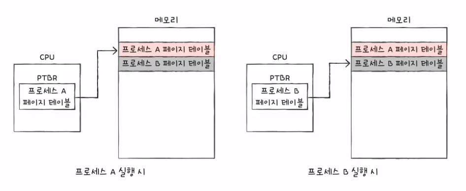 - 유효 비트(valid bit): 해당 페이지에 접근 가능한지 여부를 알려줌; 현재 페이지가 메모리에 적재되어 있으면 1, 아니라면 0임. 만일 CPU가 유효 비트가 0인 메모리에 적재되어 있지 않은 페이지로 접근하려고 하면 페이지 폴트(page fault)라는 예외(Exception)가 발생한다. (1.CPU는 기존 작업을 백업 -> 2.페이지 폴트 처리 루틴을 실행 -> 3.페이지 처리 루틴은 원하는 페이지를 메모리로 가져온 뒤 유효 비트를 1로 변경함 -> 4.페이지 폴트를 처리했다면 이제 CPU는 해당 페이지에 접근할 수 있게 됨)