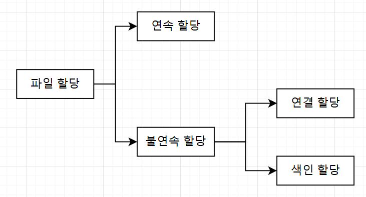 - 연속 할당(contiguous allocation): 보조기억장치 내 연속적인 블록에 파일을 할당하는 방식; 연속 할당을 사용하는 파일 시스템에서는 디렉터리 엔트리에 파일 이름과 더불어 첫 번째 블록 주소와 블록 단위의 길이를 명시함; 구현하기 쉬우나 외부 단편화를 야기함