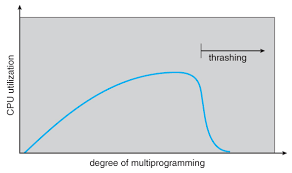 실행되는 프로세스의 수(멀티프로그래밍의 정도)를 늘린다고 해서 CPU 이용률이 그에 비례해서 증가하는 것이 아니다. 동시에 실행되는 프로세스 수가 어느 정도 증가하면 CPU 이용률이 높아지지만 필요 이상으로 늘리면 각 프로세스들이 사용할 수 있는 프레임 수가 적어지기 때문에 페이지 폴트가 지나치게 빈번히 발생하고, 이에 따라 CPU 이용률이 떨어져 전체적인 성능이 저해된다.
