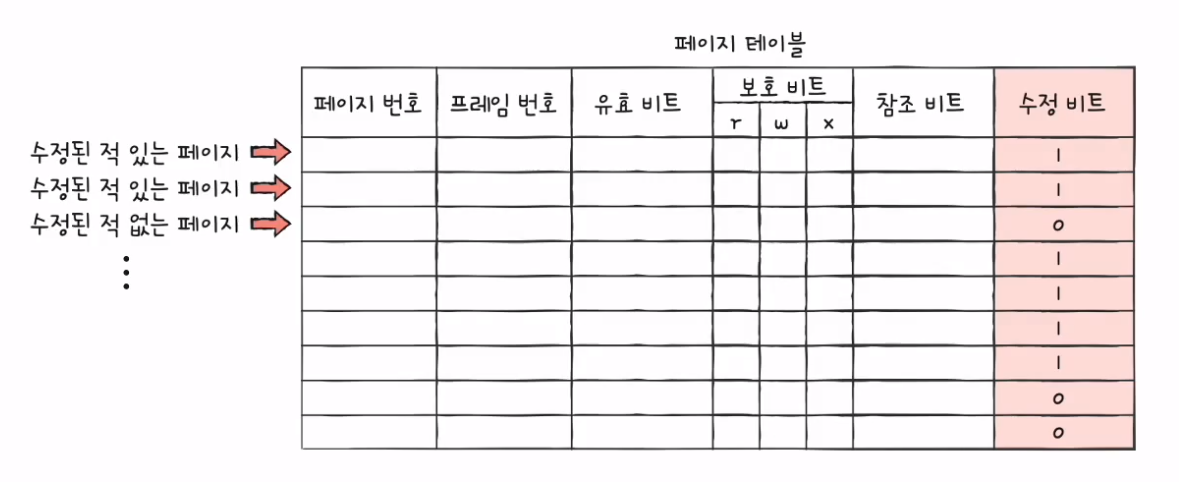 - 수정 비트(modified bit; 더티 비트(dirty bit)): 해당 페이지에 데이터를 쓴 적이 있는지 없는지 수정 여부를 알려줌. 1이면 변경된 적이 있는 페이지, 0이면 변경된 적이 없는 페이지(한 번도 접근한 적 없거나 읽기만 했던 페이지)임을 나타냄