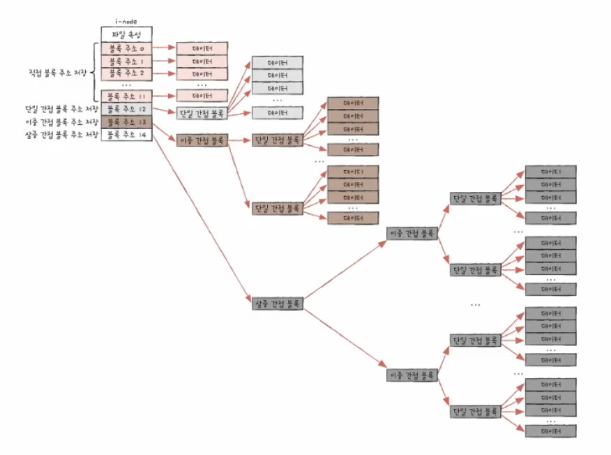 - 블록 주소 중 열두 개에는 직접 블록(direct block) 주소를 저장함